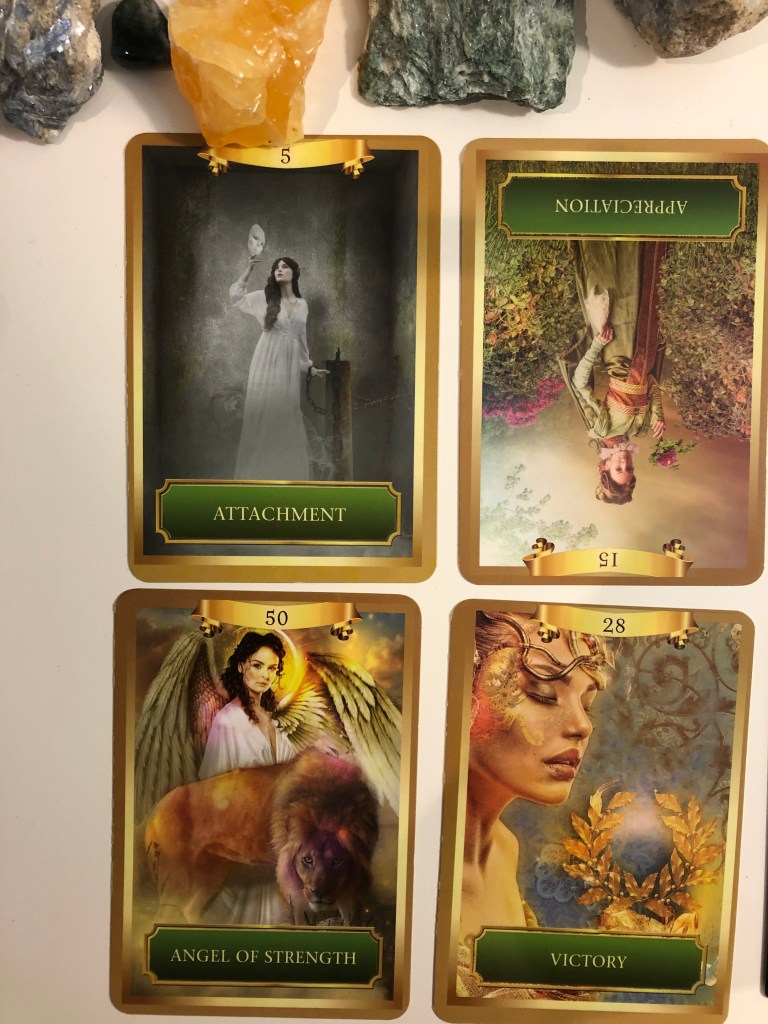 The last card is the Victory card- I feel that those going through a rough patch right now will come out of this more aligned and balanced then they previously were- more in tune with who they truly are, more aware spiritually and balanced emotionally. A lot of things will start to fall into place once the “snakeskin has been shed” weird analogy i know but that’s what I heard, we are shedding this old and waking up to the new us. Embrace it as it will make the process a lot easiest- do the work you are being guided to do, those that do not make the choices and do the work will have a harder time, with more challenges and bumps i feel – those of us that just sit back, do the healing, releasing, and shedding now will find it more less traumatic,. Learning to be one with who we are and what we want, understanding where we were, why we had to go through what we did, and understanding how much we learned and grew along the way is the true victory i heard.