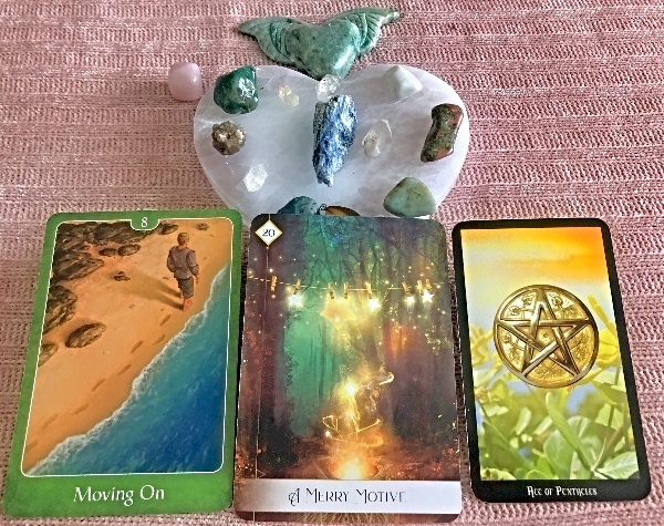 I was guided to pull from three different tarot and oracle decks, each for a part of the week. Sunday, Monday and Tuesday are represented by cards from the Psychic Tarot For The Heart. Wednesday and Thursday by The Oracle Of The 7 Energies, and Friday and Saturday by The Witches Tarot deck.