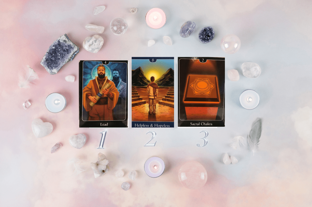 If you look at all three cards, the main colour you will see is orange. In the first card it’s in the man’s clothing. In the second card it’s the ground and stairs as well as the man’s clothing; and then we have the third card which is the sacral. So for me it all comes down to working on aligning the sacral chakra once again. Meditating, connecting with body through yoga, breath work and exercise. Bringing the chakras back into balance through foods, spiritual and energy practices and turning off any source of negative and fear based media.