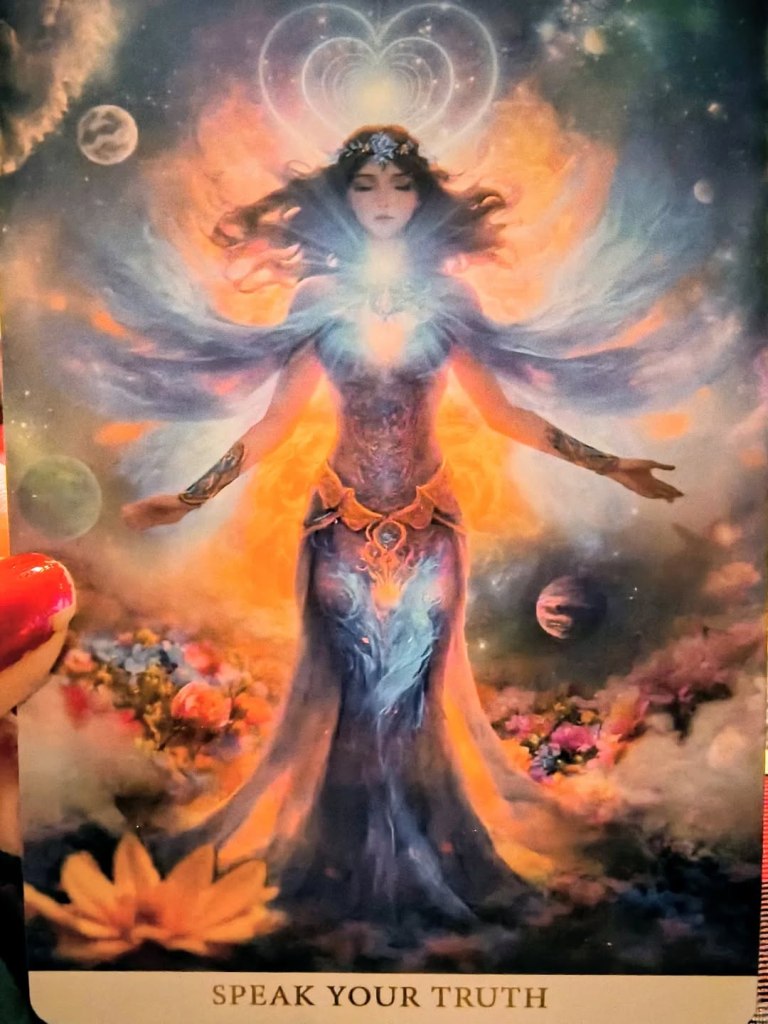 Today’s card is Speak Your Truth, and I feel this message gently resonates with many of us as we embrace our true selves, stand our ground, and reawaken our throat chakra.