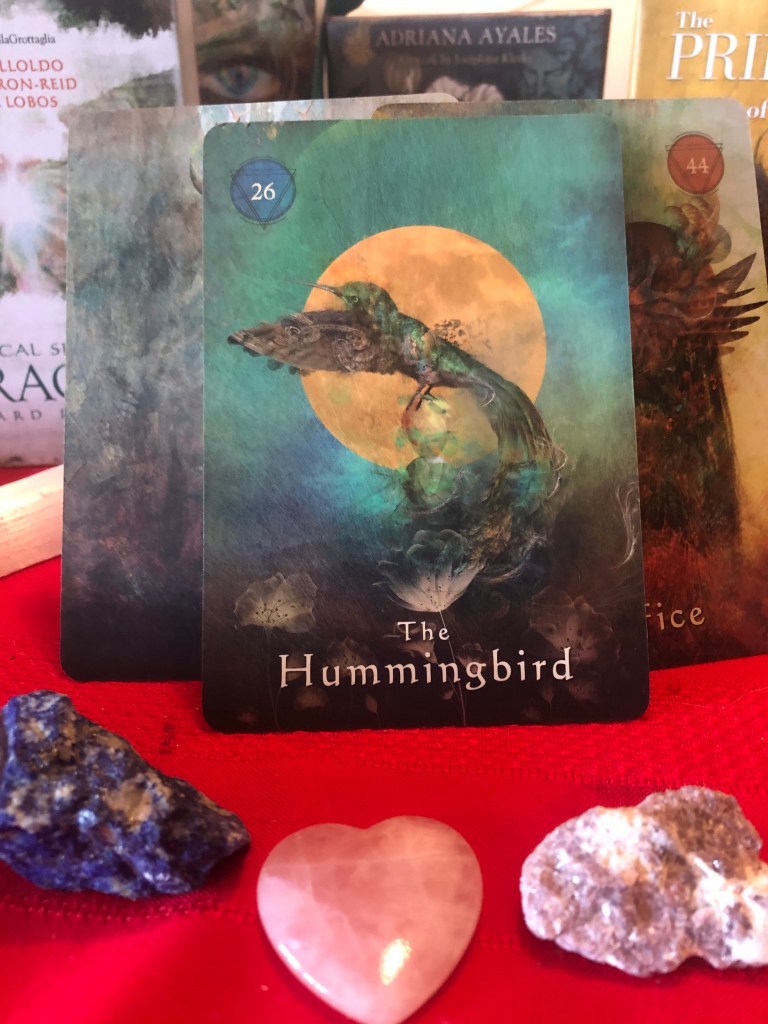 I was guided to pull some cards this morning after receiving many messages from spirit. Not only was there three beautiful crows caw and chat with me but then a humming bird fly by. And then I pulled this card, clearly there is many messages needed to be shared. This card comes from the Mystical Shaman oracle deck by Colbert-Baron Reid, Alberto Villoldo and Marcela Lobos